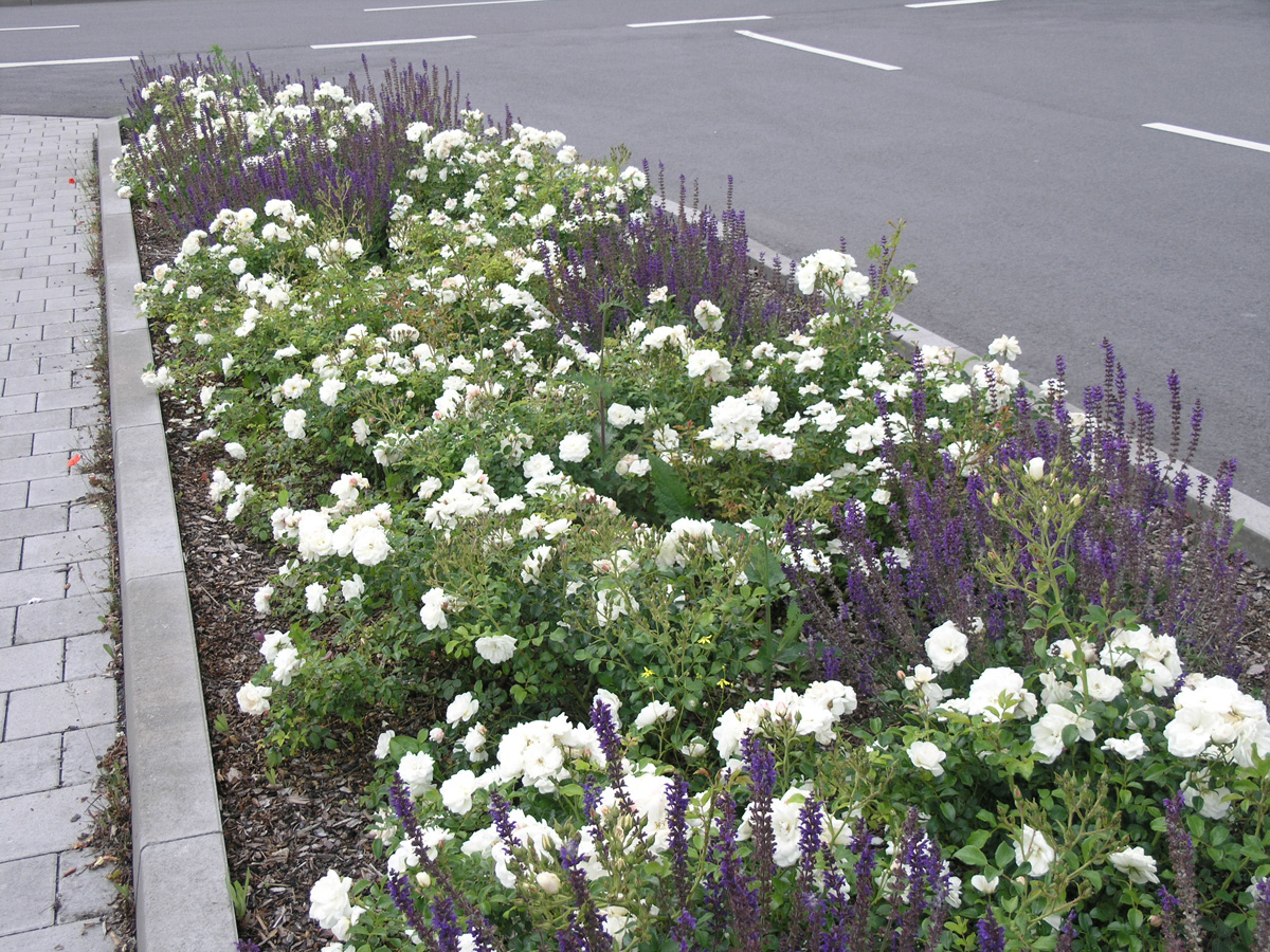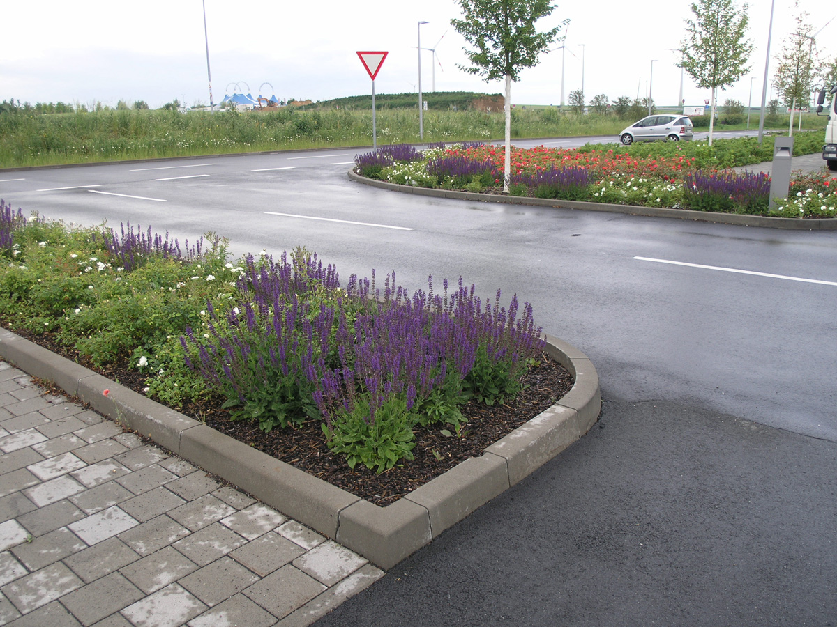 Baumpflanzungen gliedern den Raum, das Regenwasser wird in Versickerungsmulden großflächig versickert. Je weiter sich die flächige Bepflanzung von den Eingangsbereichen entfernt, desto landschaftlicher wird die Pflanzenauswahl.
