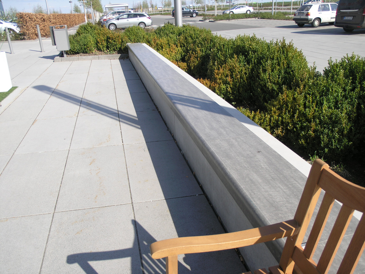 Die Flachdächer der Gebäude wurden extensiv begrünt. Die Platzflächen an den Eingängen erhielten einen Belag aus hellen großformatigen Betonsteinplatten mit einer Oberflächen-Beschichtung zur besseren Reinigung der Platten.