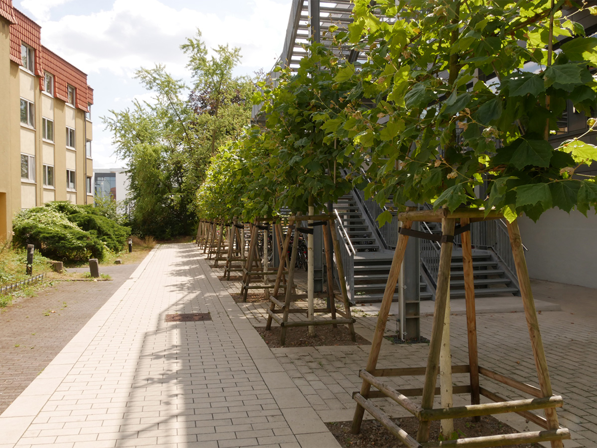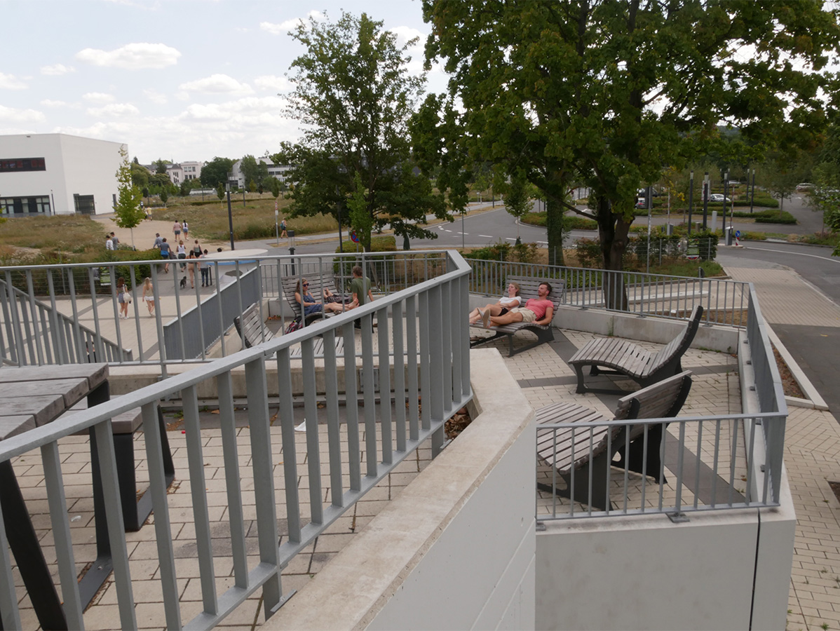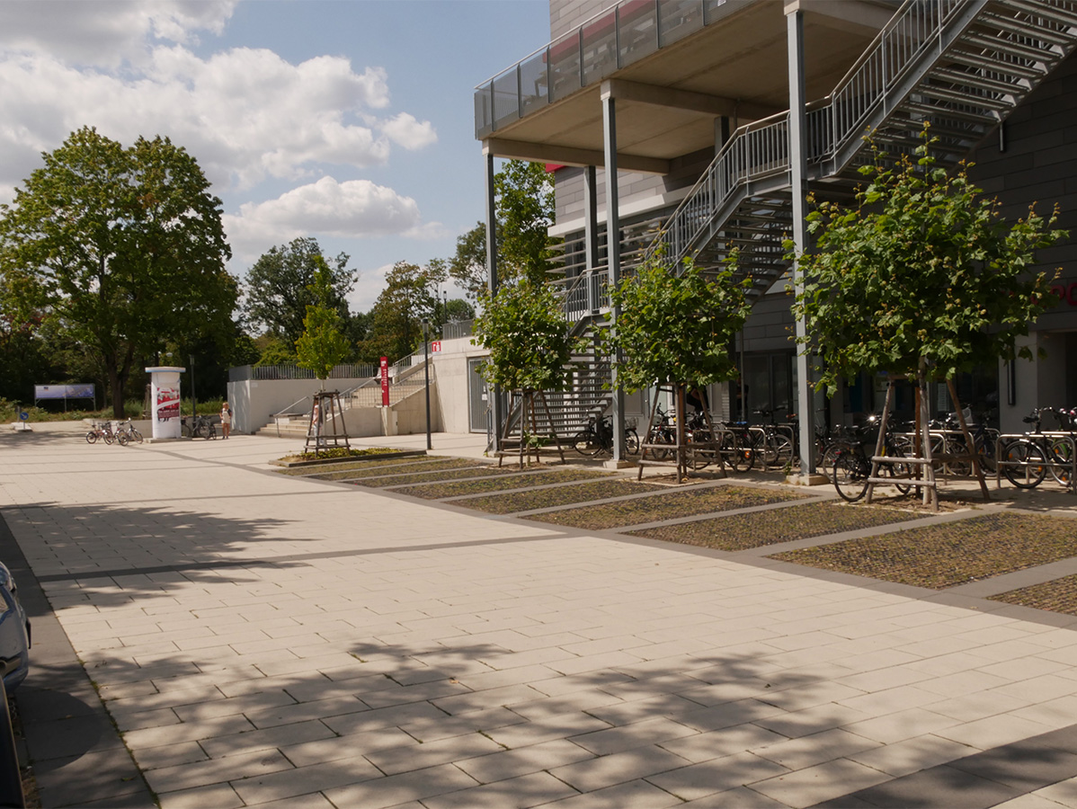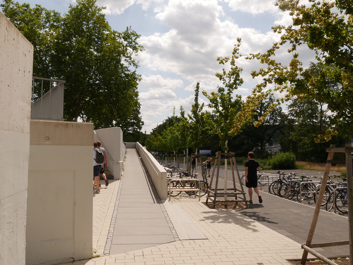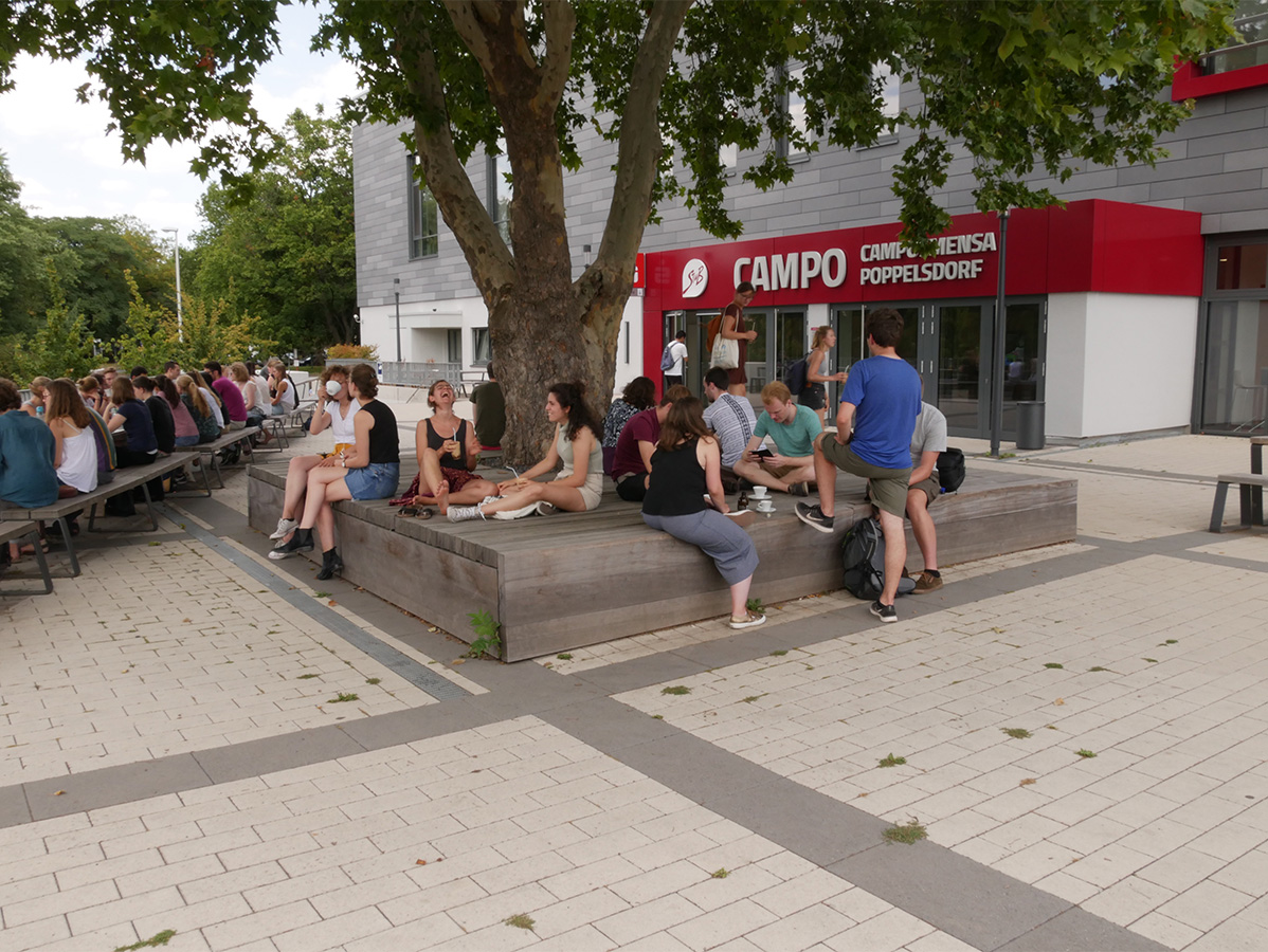 Im Zuge der Modernisierung der Mensa der Universität Bonn wurden auch die Außenanlagen überarbeitet. Mit der Neubaumaßnahme erfolgte eine teilweise Entsiegelung der Flächen. Zusätzliche Baumpflanzungen verbessern das Microklima um das Gebäude. Sitzmöglichkeiten laden zum Essen und zum Verweilen im Freien ein. Der Bau einer behindertengerechten Rampe gewährleiste den barrierefreien Zugang zur Mensa und den vorgelagerten Platzflächen.