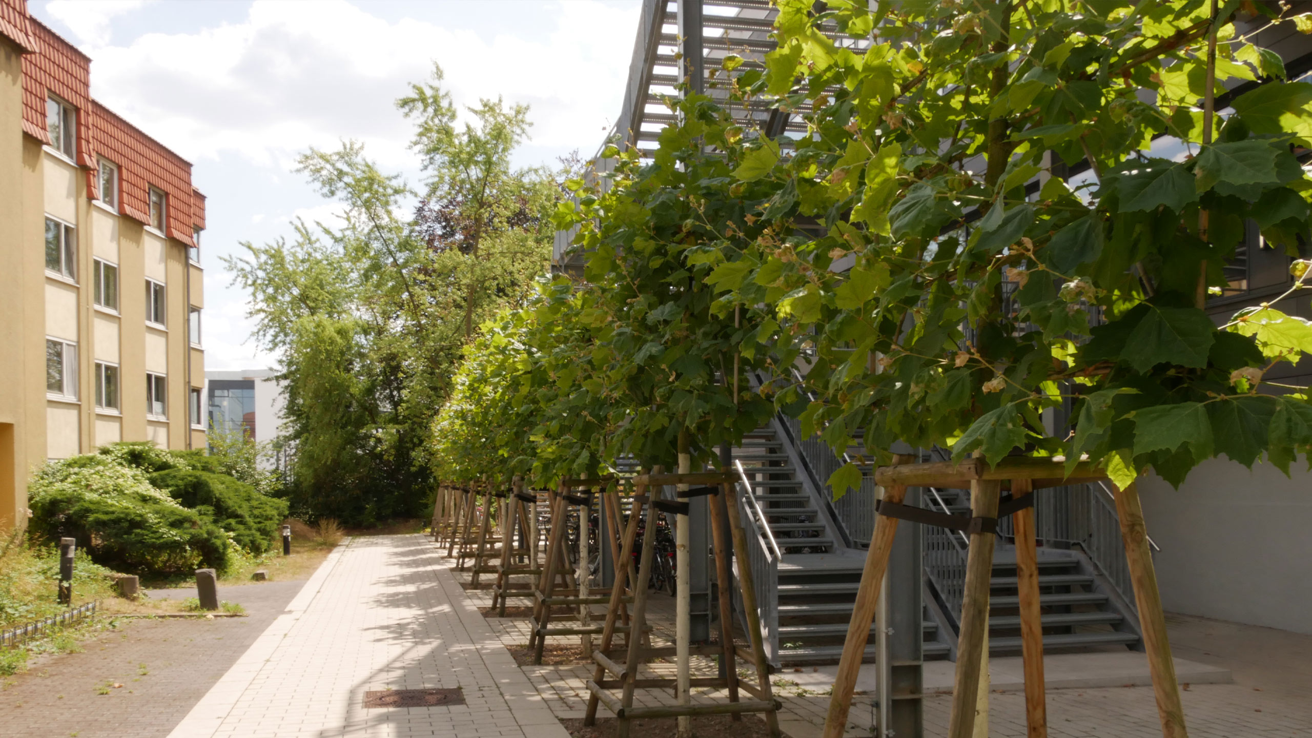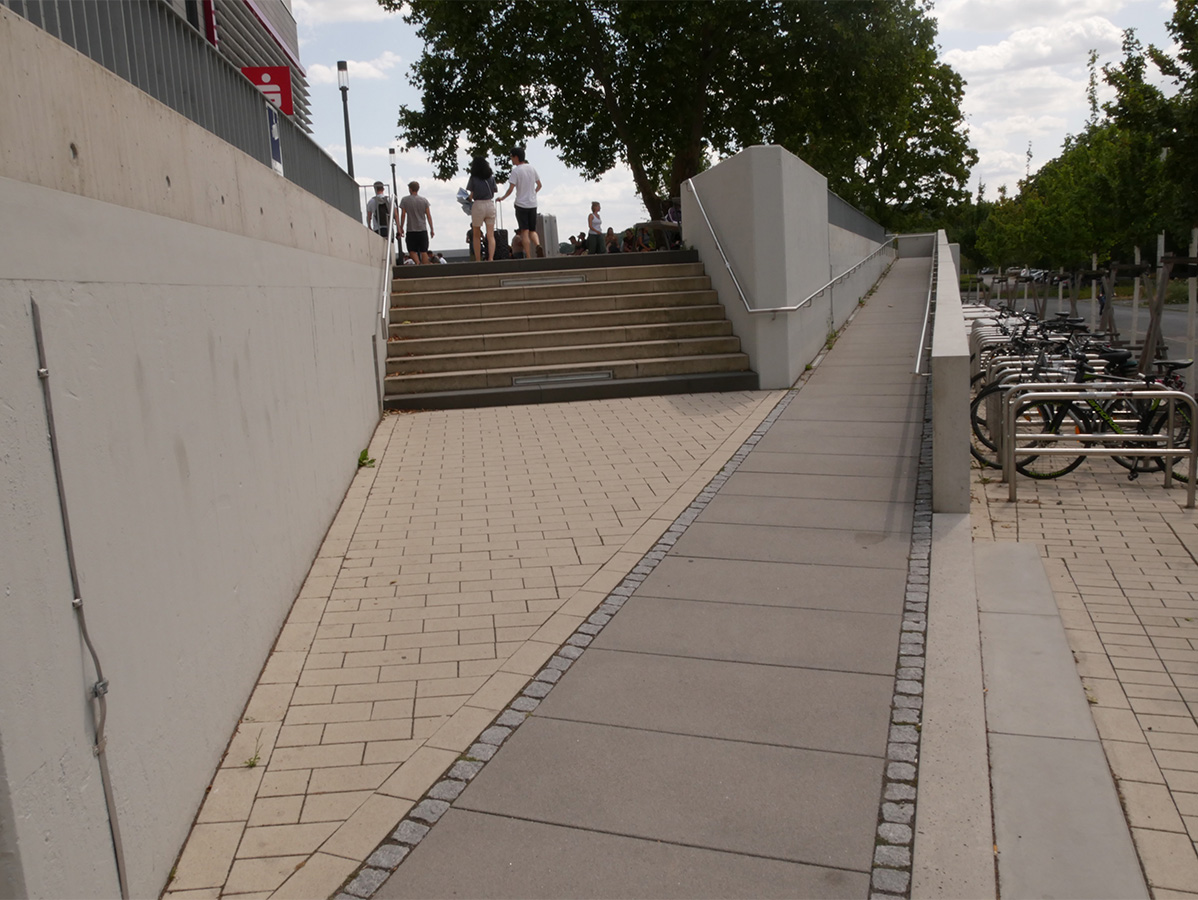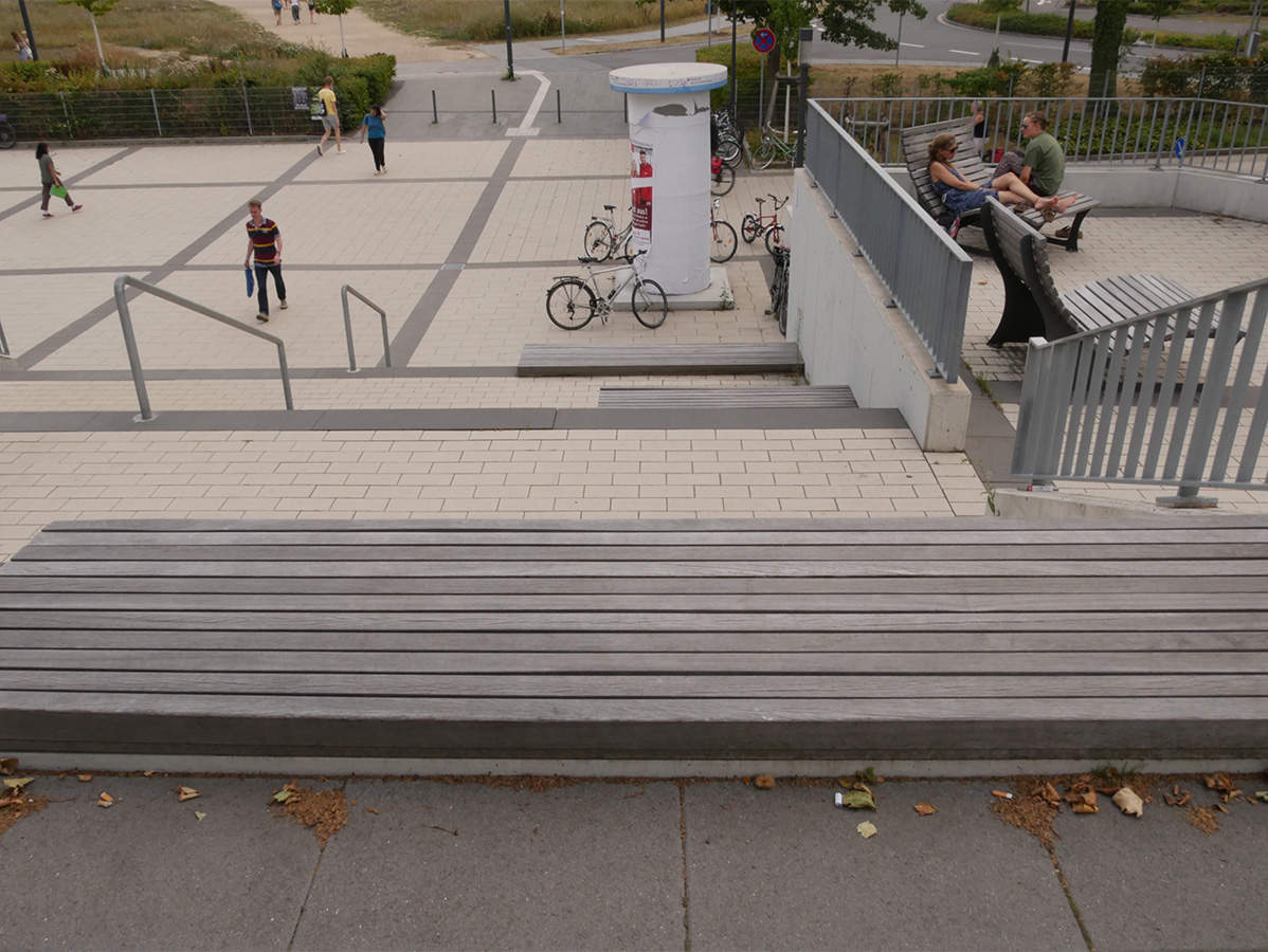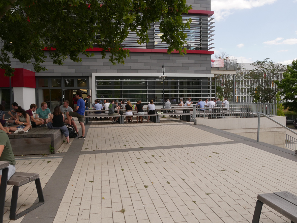 Im Zuge der Modernisierung der Mensa der Universität Bonn wurden auch die Außenanlagen überarbeitet. Mit der Neubaumaßnahme erfolgte eine teilweise Entsiegelung der Flächen. Zusätzliche Baumpflanzungen verbessern das Microklima um das Gebäude. Sitzmöglichkeiten laden zum Essen und zum Verweilen im Freien ein. Der Bau einer behindertengerechten Rampe gewährleiste den barrierefreien Zugang zur Mensa und den vorgelagerten Platzflächen.